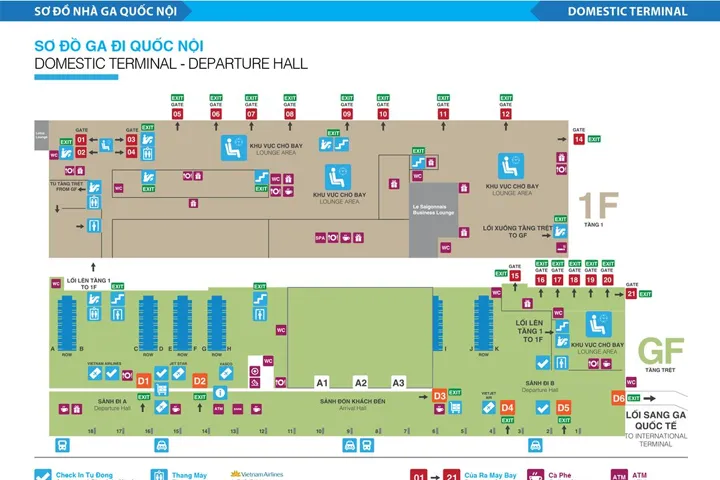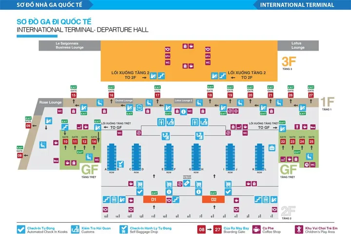 - 1st Floor (Departures): This area includes check-in counters, security checks, and gates 10 to 25. This floor also houses business class lounges.